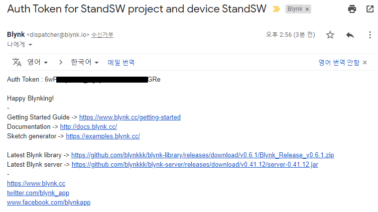 즉시 다음과 같이 토큰 안내 이메일을 받을 수 있습니다. 도착 토큰값은 후에 코딩을 할 때 필요하니 일단 보관해 둡니다.