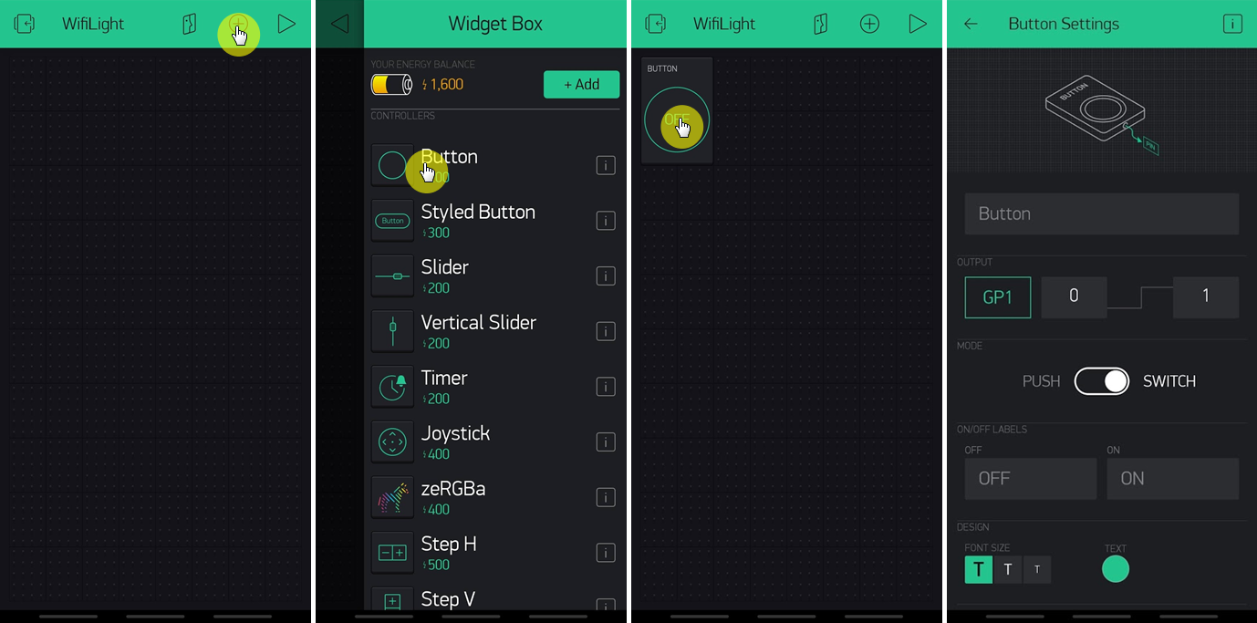 빈프로젝트의 편집화면에서 우측 상단에 있는 "+"버튼을 눌러서 새로운 위젯을 추가해줍니다. 간단히 버튼을 하나 추가해서 ESP01모듈에 있는 내장 LED를 켜고끄는 기능을 구현해 보겠습니다. 여러 위젯중에서 첫번째에 있는 "Button"을 선택해 줍니다. 그러면 프로젝트에 "OFF"라고 표시된 버튼이 생성되는데요. 생성된 버튼을 눌러서 버튼의 기능을 만들어 줍니다.