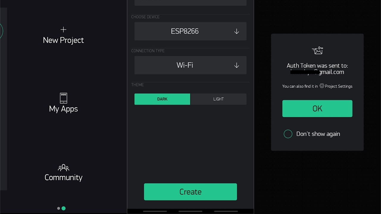 Blynk앱에서 새로운 프로젝트를 시작해서 해당 프로젝트의 토큰값을 생성합니다. "New Project"로 시작을 하면 사용하는 보드의 종류와 접속 방법을 선택하라고 합니다. 저는 EPS01모듈을 사용하기 때문에 EPS8266을 선택하고 접속방법은 WIFI를 선택해줍니다.