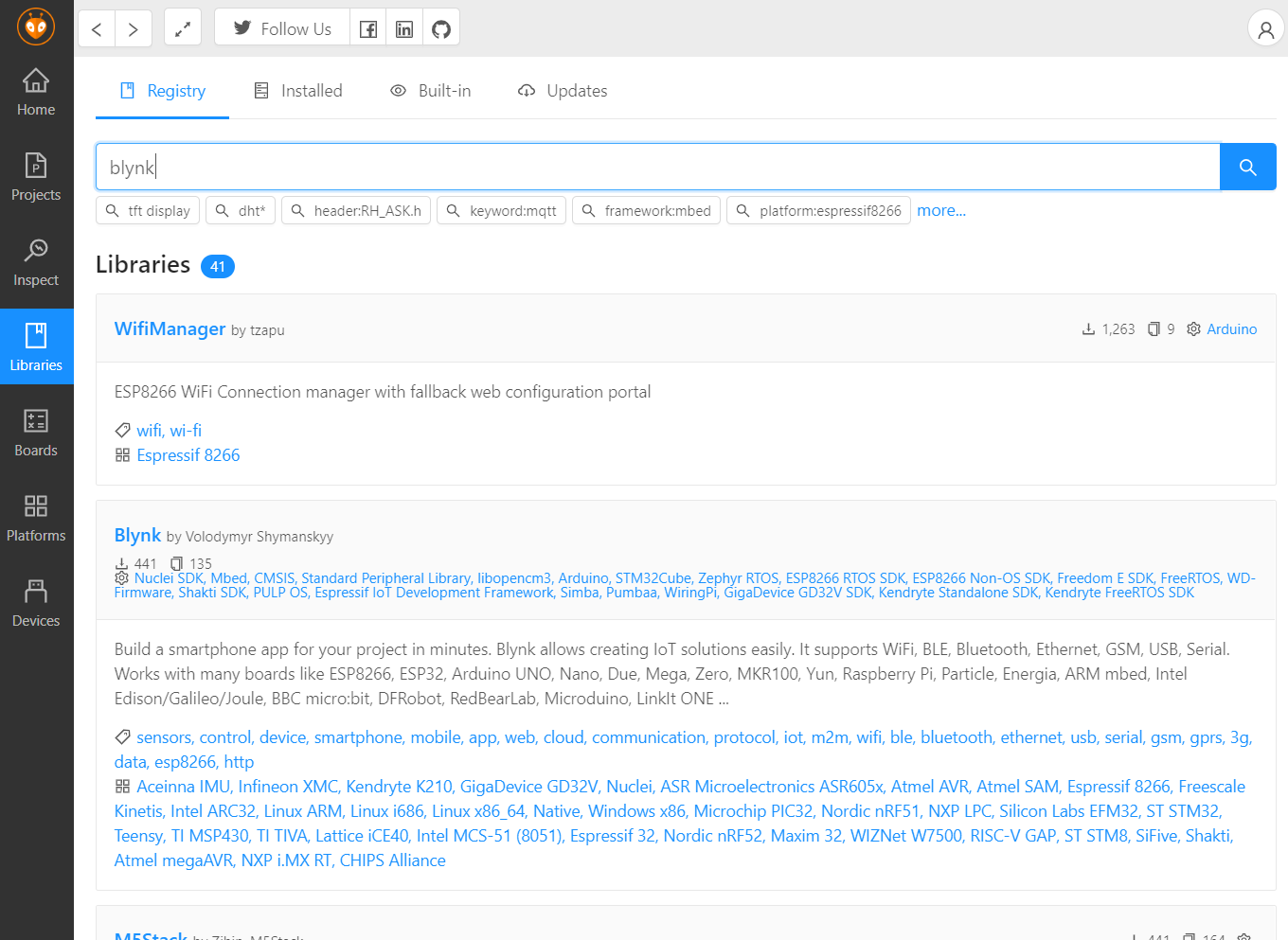 위의 사진은 PlatformIO IDE에서 라이브러리를 검색한 모습입니다.