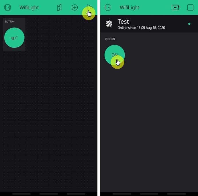 실행이 되고나서 ESP01모듈과 연결이 되면 오른쪽 그림과 같이 연결 상태를 확인할 수 있습니다. 이제 버튼을 눌러보면 누를때마다 LED가 켜고 꺼지는 것을 알 수 있습니다.