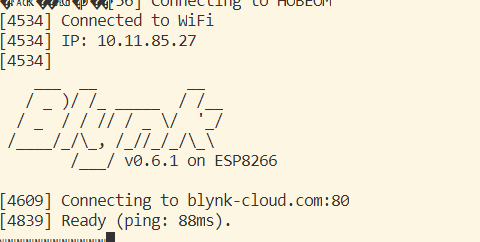 업로드 모드에서 펌웨어 업로드가 완료되었다면 ESP01을 동작모드로 전환해서 리셋해줍니다. 정상적으로 Blynk코드가 실행된다면 다음과 같은 메시지를 시리얼 모니터로 확인할 수 있습니다.