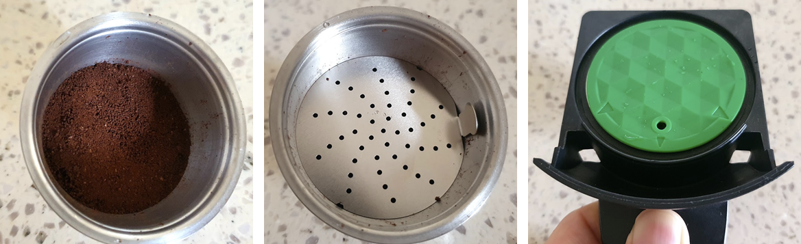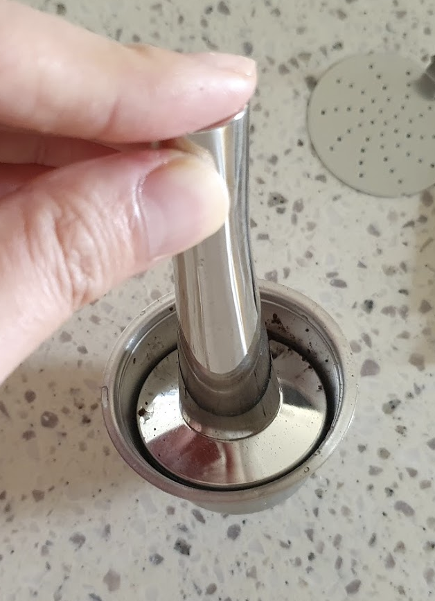 캡슐 안쪽을 보면 아래 그림처럼 커피가루 위에 덮는 스테인리스 커버말고 바닥쪽에도 스텐리스 망이 있습니다. 그런데 이 아래쪽 구조는 어떻게 생겼는지 모르겠지만 분해가 안 되는 구조로 되어 있습니다. 그래서 커피 다 뽑아 먹고 나서 캡슐을 씻을 때 저 망 아래에서 계속 흘러나오는 커피가루들 때문에 찜찜함이 남아있는데 어디에도 분해 세척 방법이 나오지 않아서 그냥 그대로 두고 있습니다.