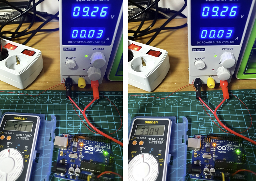 방법은 아두이노에 내장된 스탭다운 모듈을통해서 출력되는 전압을 멀티미터로 측정했을 때 아두이노 스펙과 동일한가를 확인해 보는겁니다.. 예전에 어디서 그런 글을 읽은것 같았습니다. 아두이노에 입력전원이 충분히 안정적인 경우 출력전원에는 상당히 정확한 5V 및 3.3V전압이 걸린다고요. 그래서 전원공급장치로 외부전원으로 7V이상의 전원을 넣어주고 5V와 3.3V 각각에 전압을 측해봤습니다.