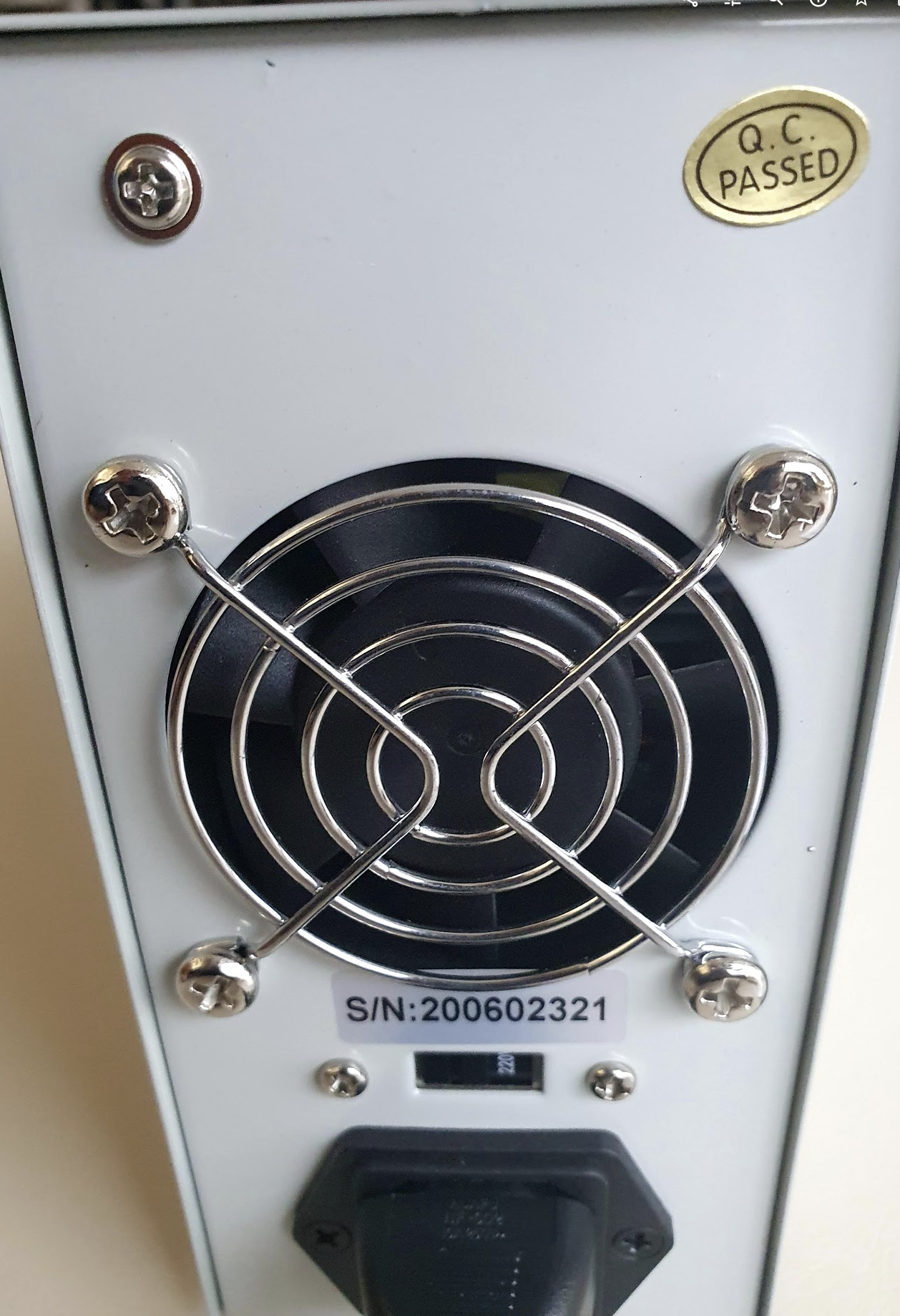 본체 뒷면을 보면 내부 품질관리 기준을 통과했다는 스티커도 붙어있네요. 그 아래로 냉각팬 그리고 입력 전압 조절 스위치와 전원 단자가 있습니다.