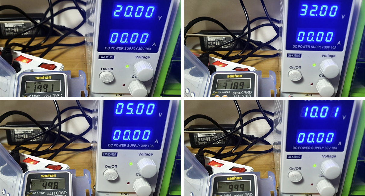 5, 10, 20, 32V로 설정했을때 걸리는 전압을 찍은 사진입니다. 결론적으로는 약간의 차이가 발생하긴하네요. 그리고 그 차이도 선형적이지 않고 전압에 따라서 편차가 있습니다. 저 전압 쪽에서는 약 0.02V전도의 차이가 있고 20V에서 0.09V차이 그리고 높아질수록 그 차이가 조금더 커지는 결과를 보여주었습니다. (부하를 걸어서 전류가 흐르는 상태에서도 확인해 보면 좋겠지만 적당한 DC load를 어떤걸 사용해야 할지 잘 몰라서 그냥 생략했습니다. 나중에 적당한 부하가 있으면 내용 추가하려 합니다.)