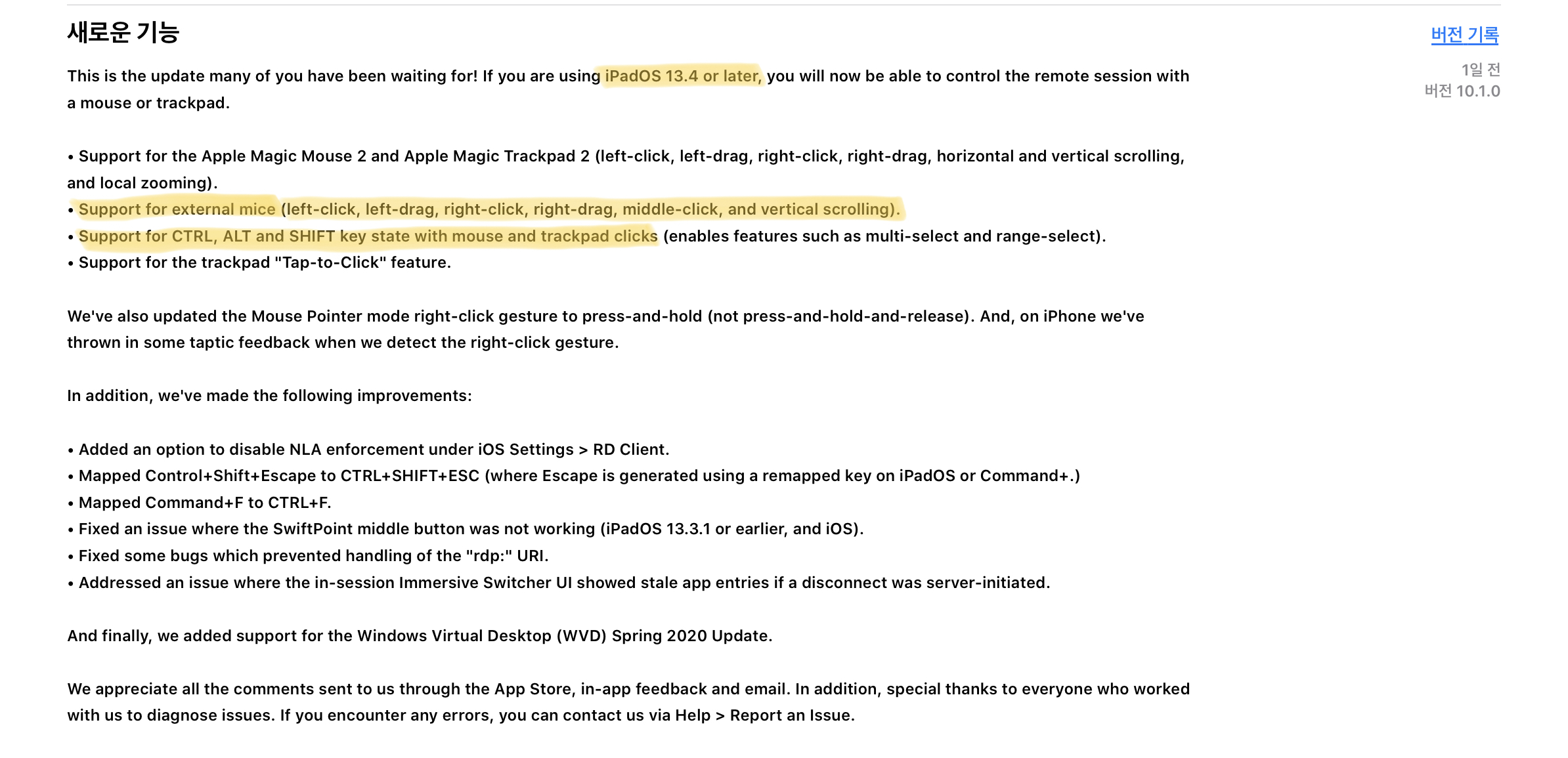 iOS용 Microsoft Remote Desktop(RDP)이 오랜만에 업데이트 되었습니다. 아주 오래전부터 유용하게 써오던 앱인데 아이패드를 사용하면서 부터는 마우스 문제도 그렇고 그리고 앱 자체의 버그? 에러? 때��