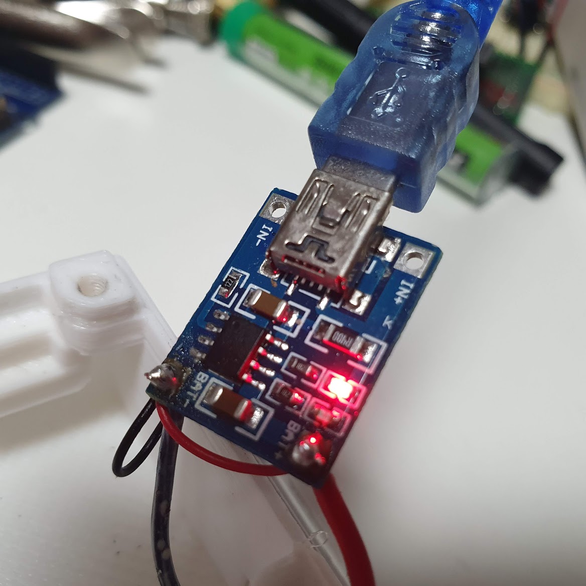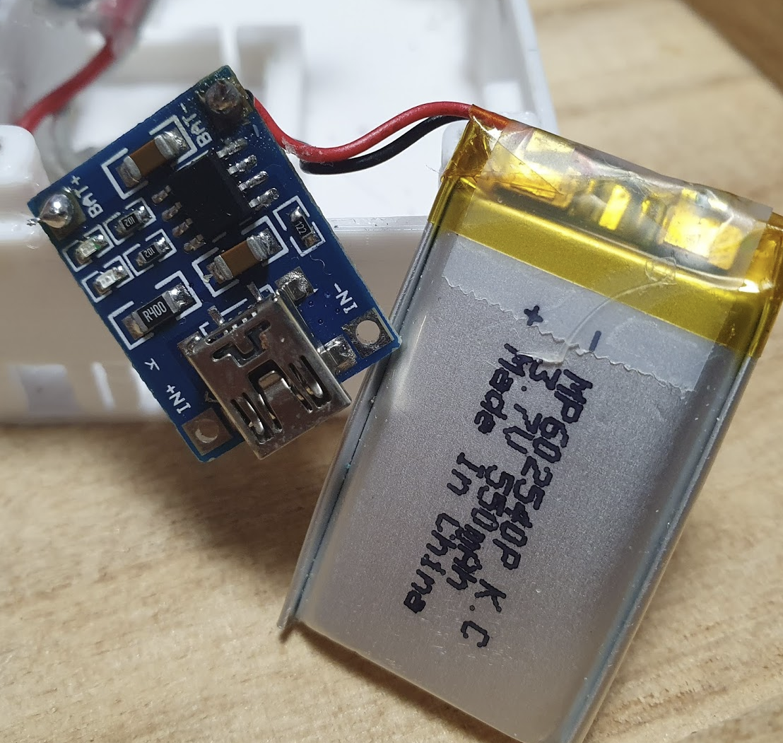제가 구매해본 리튬폴리머 배터리와 충/방전 모듈 TP4056 입니다. 배터리는 커넥터 단자로 되어있는데 사진은 편의상 모듈에 납땜해버린 모습입니다.