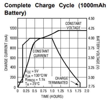 TP4056 칩은 충전 시 전압과 전류를 조절해서 안정적인 충전이 되도록 하는데요. 아래 그래프는 1000mAh 배터리의 충전 사이클입니다. 시간이 지나고 배터리가 충전이 되면서 전압이 급격하게 올라가다가 충전이 어느 정도 되고 나면 전압 상승 속도가 느려집니다. 그러다가 완충에 가까워지면 충전 전류가 떨어지기 시작합니다. 그래프에서 1시간이 지났을 때 충전 전류가 떨어지기 시작하는데요. 그러다가 전류값이 최대 전류의 10%가 되는 지점에서 전류가 완전히 차단되어 과충전을 방지하는것을 볼 수 있습니다. 여기서 모듈 사용 시 주의할 점이 있는데 부하가 걸려있는 상태에서 충전을 하는 건 피해야 한다고 합니다. 부하가 걸려있으면 충전 전류 모니터링이 원활하지 않아서 완충 시 전류 차단 기능이 정상적으로 동작하지 않을 수도 있다고 합니다.