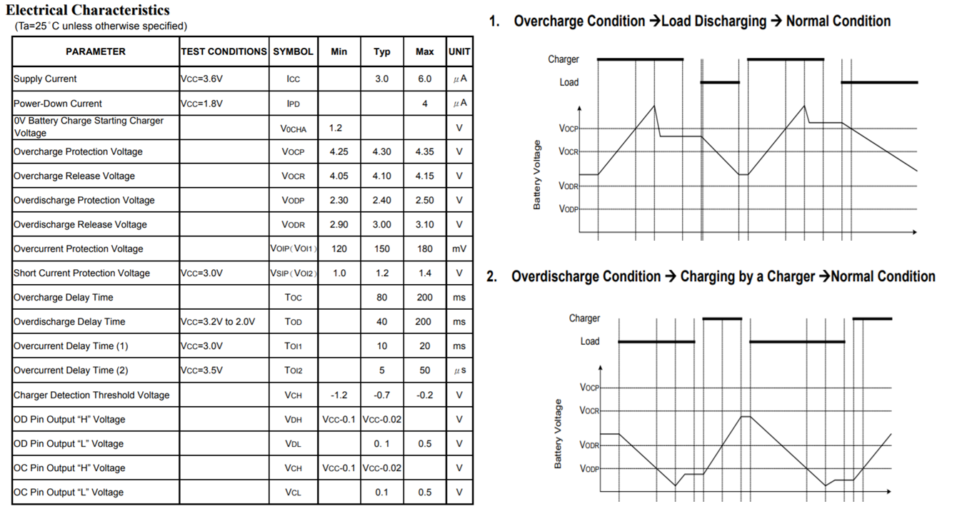 DW01A 데이터 시트를 보면 Overcharge Protection Voltage는 4.3V이고 Overdischarge Protection Voltage(Vocp)는 2.4V인 것을 볼 수 있습니다. 앞에서 TP4056이 4.2V의 일정한 전압을 잡아주기 때문에 DW01A칩은 과충전 부분보다는 과방전 부분에 중점적인 역할을 할 것 같습니다.