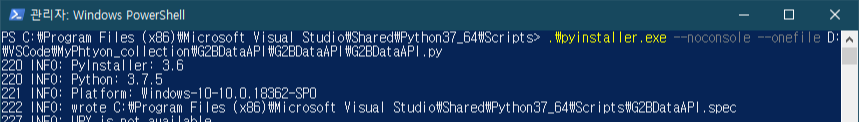 파워웰에 다음과 같은 명령어로 파이썬 코드를 실행파일로 패키징합니다.