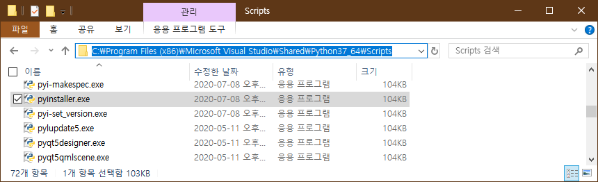 Visual Studio환경에서 pyinstaller를 설치하면 다음 경로에 설치가 됩니다. (C:\Program Files (x86)\Microsoft Visual Studio\Shared\Python37_64\Scripts)