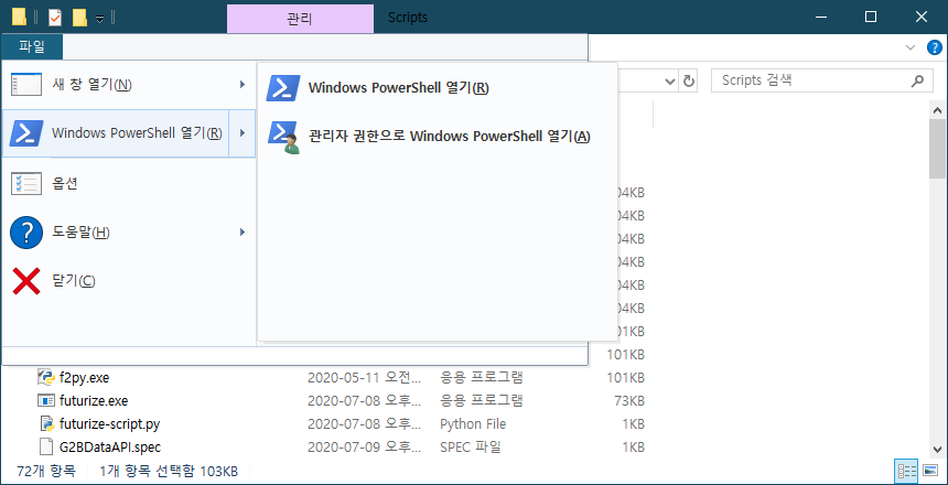 pyinstaller.exe파일이 설치된 위치로 이동을 한 다음 파일 탐색기 메뉴에서 "파일 > Windows PowerShell 열기"를 선택해서 파워쉘을 열어줍니다.
