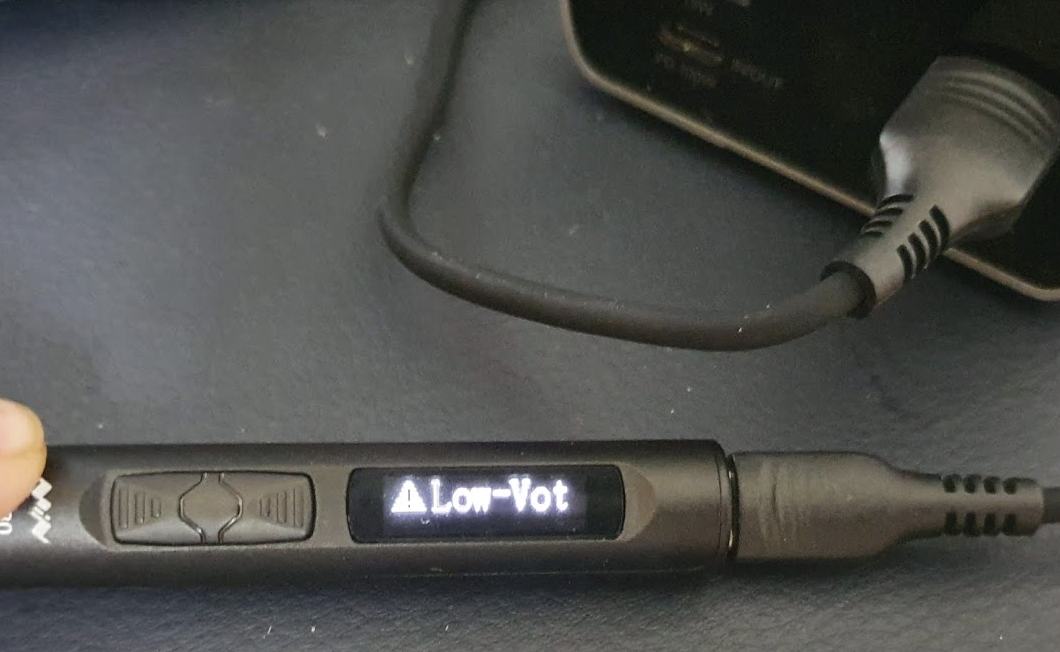 외장배터리의 종류에 따라 아래 사진처럼 저전압 오류가 뜨면서 인두기를 사용할 수 없는 경우가 발생하기도 합니다. QC3.0을 지원하는 외장 배터리라고 하더라도 약간의 차이가 있는 것 같습니다.