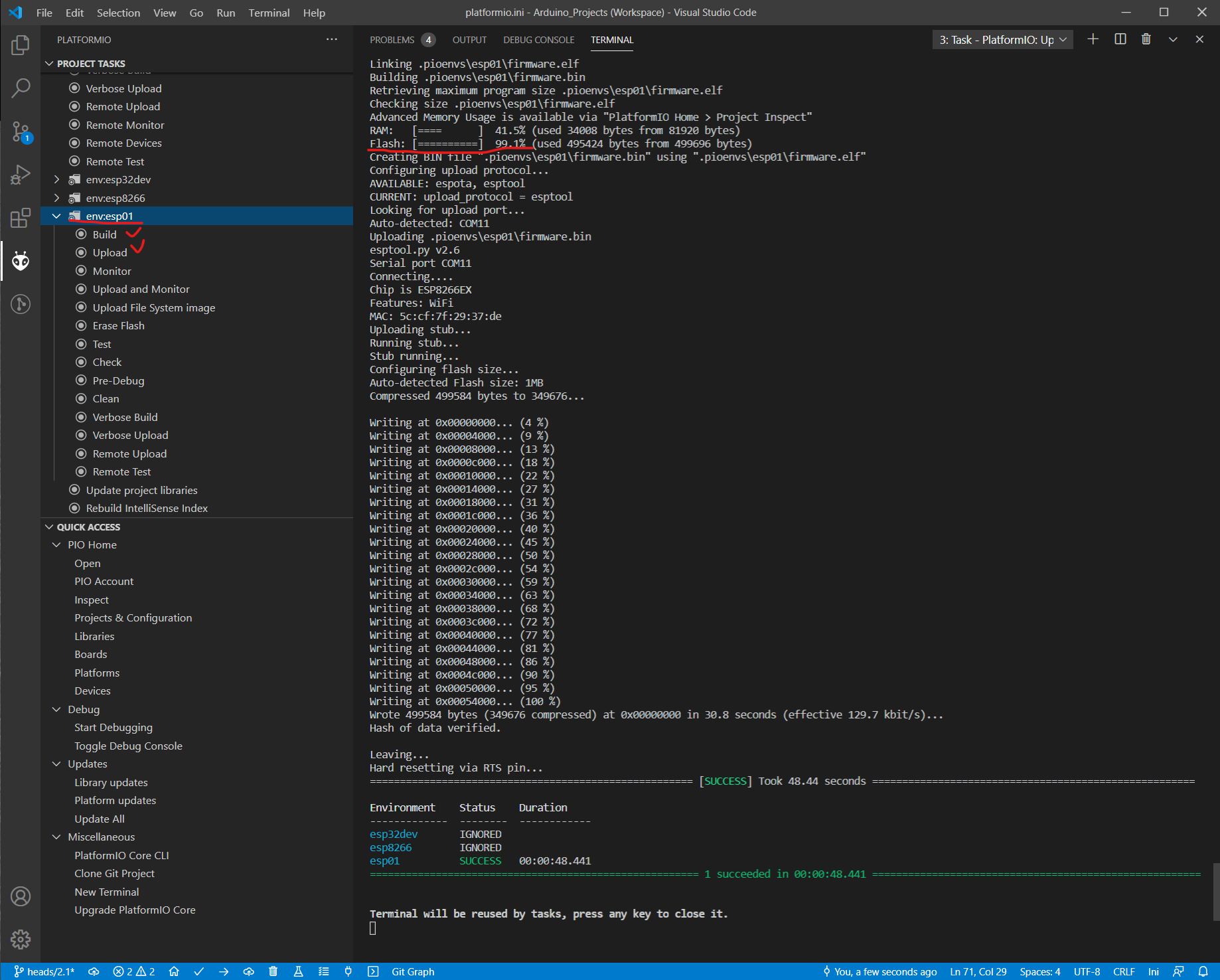 PlatformIO 메뉴에서 새로 만든 섹션 [env:esp01]의 메뉴를 찾아서 빌드와 업로드를 진행합니다.
