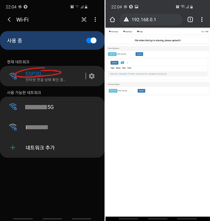 ESP01 모듈의 회로에서 GPIO0에 연결되어 있는 GND 선을 제거하고 모듈을 리셋합니다. 그리고 스마트폰을 이용해서 와이파이를 검색해서 방금 업로드한 펌웨어가 실행되는지 확인합니다. 펌웨어가 정상적으로 동작을 하고 있다면 ESP3D라는 이름의 SSID가 검색이 될 건데요. 초기 비밀번호 "12345678"로 연결을 한 뒤 "192.168.0.1"주소로 접속을 해보면 아래 오른쪽 그림과 같이 ESP01 모듈에서 구동되는 서버로 접속할 수 있습니다. 지금은 웹서버 파일을 업로드하지 않은 상태라서 index.html 파일이 없다는 메시지가 나오고 있습니다.