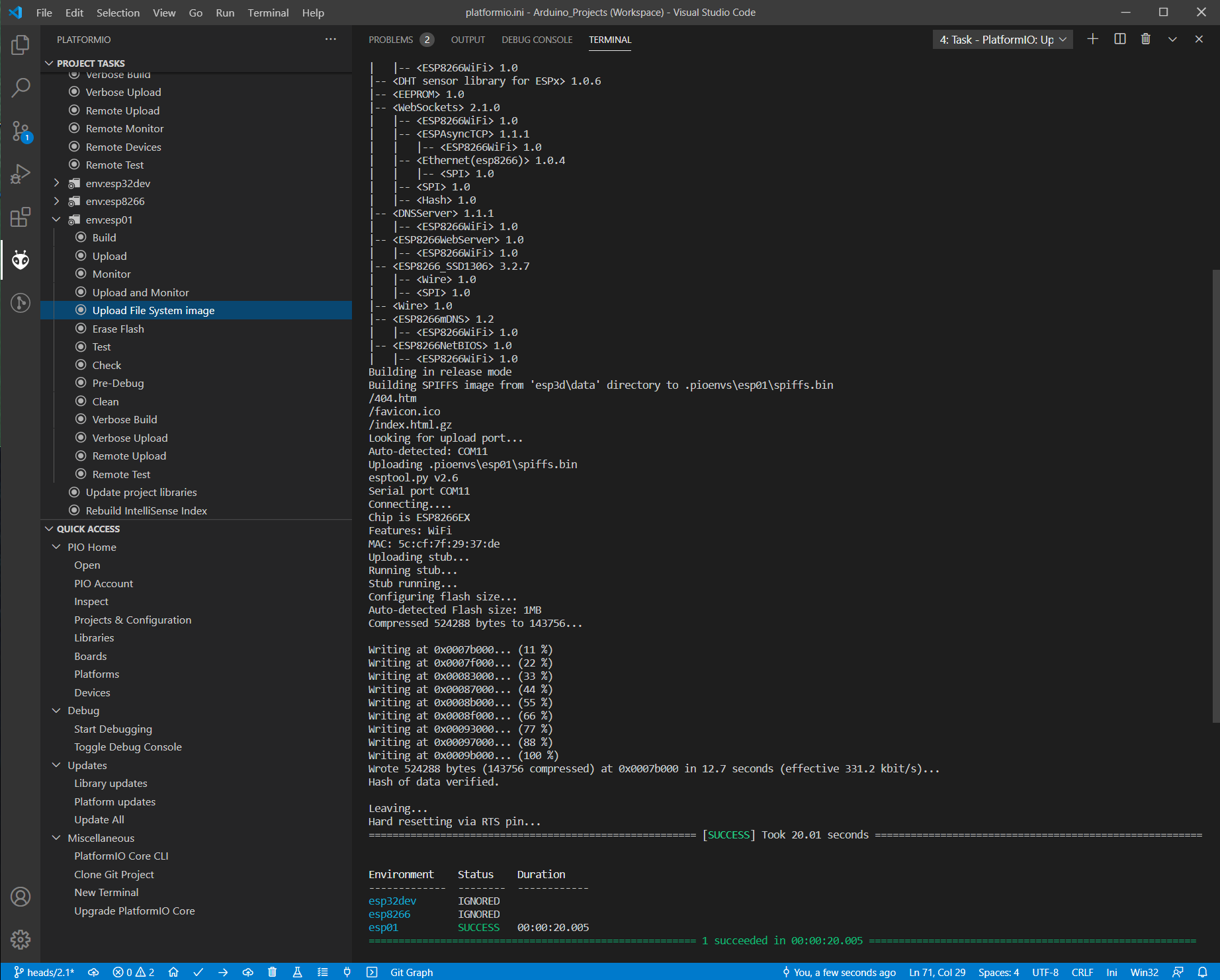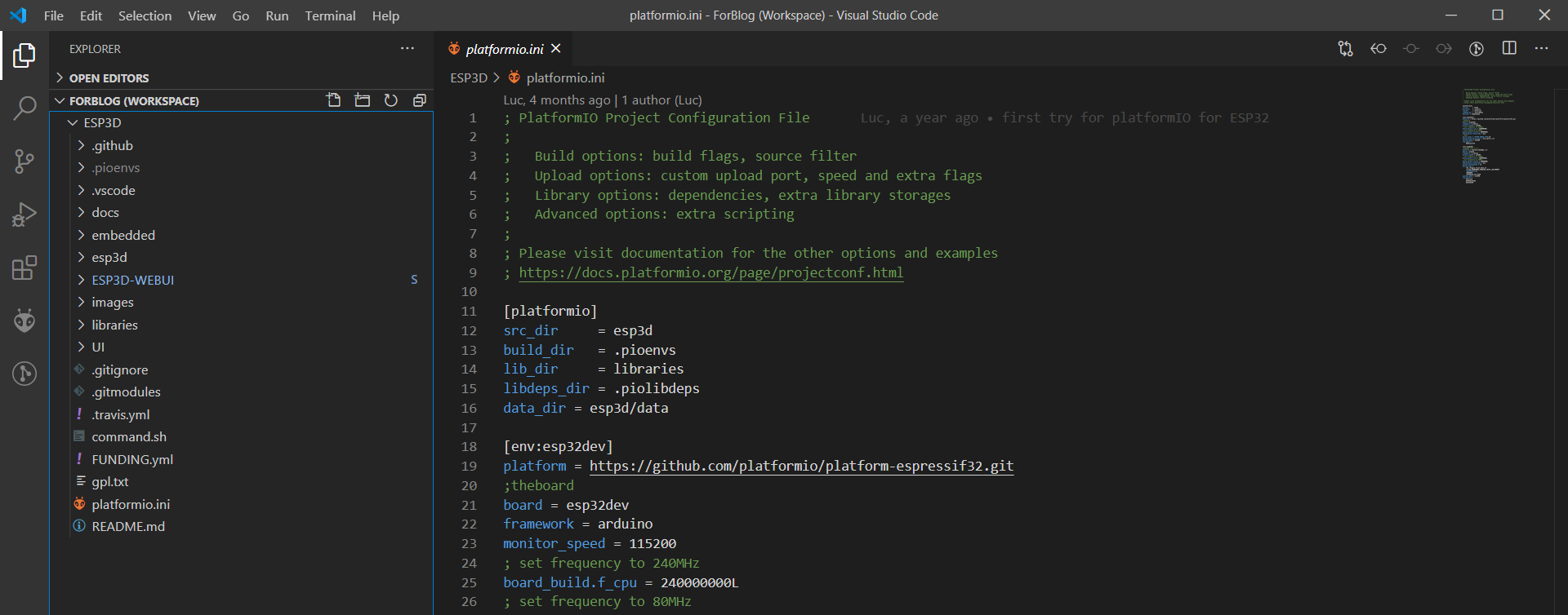 앞에서 다운로드하였던 ESP3D를 VS Code의 Workspace로 가져옵니다. 이미 프로젝트 파일에는 PlatformIO.ini파일이 포함되어 있고 ini파일에는 ESP8266 보드의 설정까지 작성되어 있습니다. 바로 컴파일 한번 시도해봅니다.