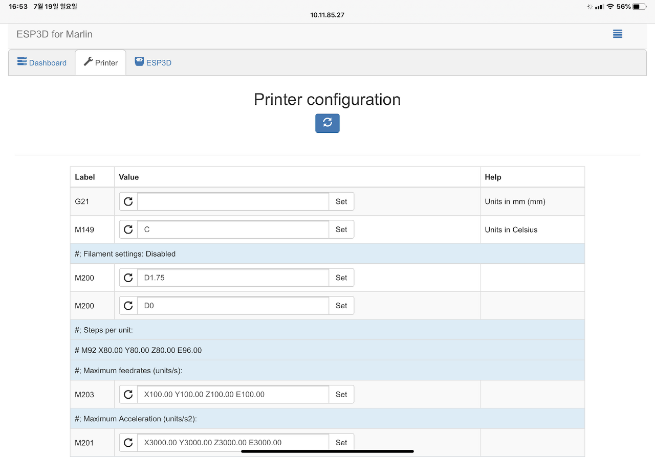 자 두근두근, ESP서버로 접속을 해봅시다. ESP3D 메뉴에서 두 번째 "Printer"메뉴로 이동을 해서 화면 가운데 새로고침 버튼을 눌러주면 프린터와 와이파이 모듈이 잘 연결되어서 정상적으로 인식이 되면 아래 그림처럼 프린터 설정을 할 수 있는 옵션들이 화면에 나타나게 됩니다. 드디어 와이파이 3D프린터를 사용할 수 있게 되었습니다. ^^