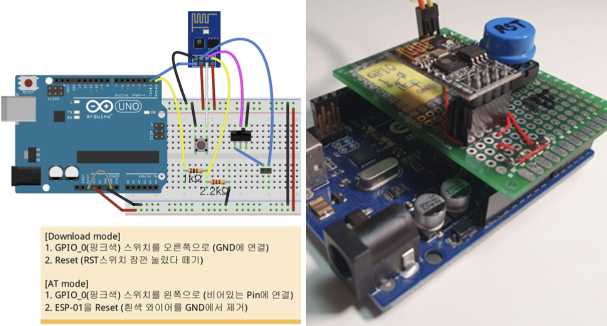 펌웨어를 업로드로 들어가기 전에 준비해야 할 것이 하나 더 있습니다. ESP01 모듈을 컴퓨터와 연결시켜줄 USB 브릿지를 만들어야 합니다. 얼마 전에 아래 사진처럼 아두이노 우노의 쉴드 처럼 만들어둔 부품을 사용했습니다.