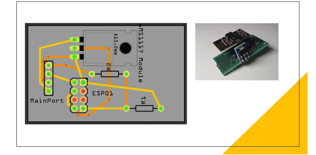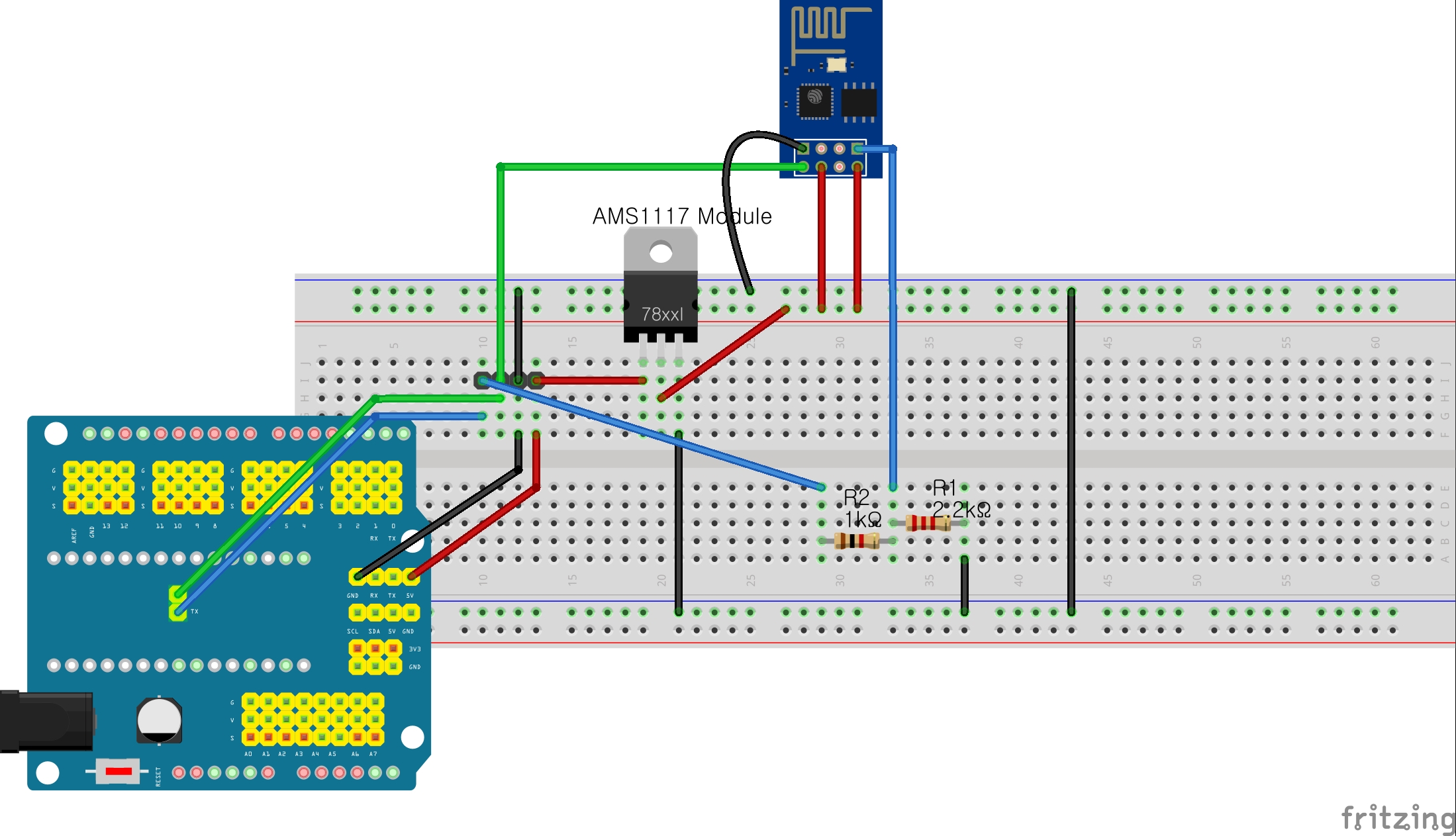 일단 Trigolila보드에서 오는 Tx신호의 전압이 5V이기 때문에 1kΩ, 2.2kΩ저항을 이용해서 전압을 다운시킨 신호가 ESP01 모듈로 들어가도록 했고, ESP01 모듈용 전원은 앞에서 찾았던 UART3 포트에서 5V와 GND단자를 이용했습니다. 그런데 마찬가지로 전원 5V를 ESP01 모듈이 이용할 수 있도록 3.3V로 강하시켜주기 위해서 AMS1117-3.3V모듈을 사용했습니다. AMS1117 모듈이 가격도 저렴하고 사용하기도 편리했고 또 마침 3.3V출력용 모듈을 판매하고 있어서 사용해 봤습니다.
