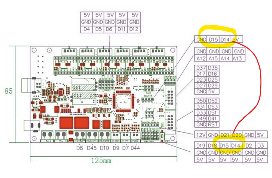 인터넷을 좀 찾아보니 아래와 같은 문제가 있었습니다. 아래 그림은 Trigolila보드의 핀 배열인데요. UART3번의 Tx, Rx 핀으로 사용되는 D15, D14번이 리미트 스위치 연결용 단자로 사용되고 있는 걸 볼 수 있습니다. 그래서 이미 사용하고 있는 리미트 스위치를 다른 핀으로 옮기고 D14, 15번 핀을 어디에서도 사용하지 않도록 Marlin코드를 수정해 주어야 UART3번을 사용할 수 있는 거죠. Marlin은 워낙 복잡한 프로그램이라서 해볼 엄두가 나지 않아서 이 방법은 포기하기로 했습니다.