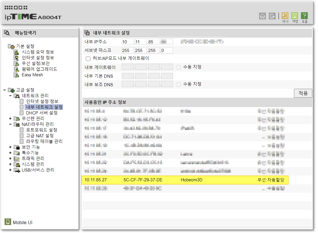저는 ipTime공유기를 사용하고 있는데요. "내부 네트워크 설정"이라는 메뉴에 들어가면 접속되어 있는 클라이언트들을 확인할 수 있는데요. 앞에서 설정한 "Hobeom3D"가 "10.11.85.27" 주소를 할당받아서 접속되어 있는 것을 볼 수 있습니다.