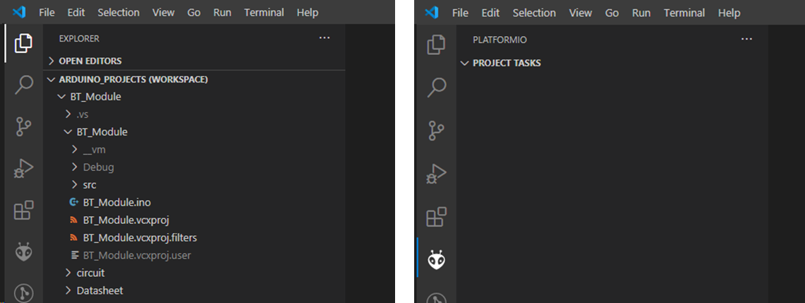 PIO에서 새로 만든 프로젝트가 아니라 불러온 파일이기 때문에 PlatformIO.ini파일이 없습니다. 따라서 PIO메뉴로 이동을 해보면 "Project Tasks" 메뉴 아래 사용 가능한 메뉴가 아무것도 없는 것을 알 수 있습니다.