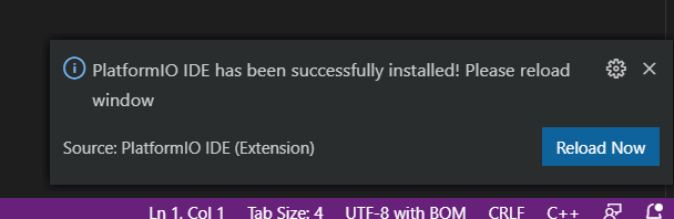 설치가 끝났으니 VS Code를 재시작하라는거 같은데 "Reload Now"를 눌러주면 VS Code 전체 화면이 깜빡하면서 다음과 같은 화면을 만날 수 있습니다. 좌측 패널 메뉴에 외계인? 개미? 얼굴 같은 PIO의 로고가 추가된 것을 보실 수 있습니다.