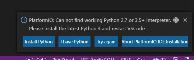 그리고 PIO는 파이썬으로 만들어져 있어서 컴퓨터에 파이썬이 설치되어 있어야 사용할 수 있는데요. 만약 파이썬이 설치되지 않았다면 VS Code 우측하단에 이런 알람을 받으실 수 있습니다.