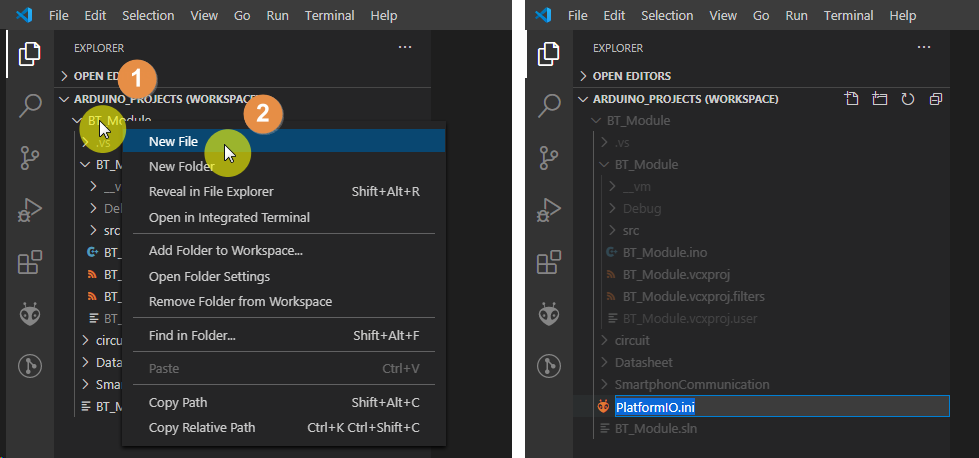워크스페이스에서 불러온 프로젝트 이름을 우클릭하고 "New File"메뉴를 선택해서 파일을 추가합니다. 그리고 파일 이름을 "PlatformIO.ini"로 만들어줍니다. 그리고 만들어진 파일 안에다가 일단 아래 내용을 붙여넣기 하겠습니다.