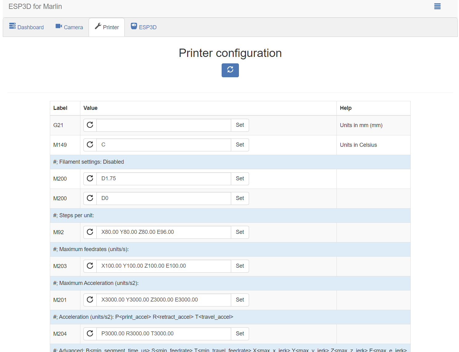 "Printer" 탭에서는 프린터 EEPROM에 저장된 세팅값을 변경할 수 있습니다. M501코드로 확인할 수 있는 내용들을 이 탭에서 확인 할 수 있고 수정도 가능합니다. 하지만 수정된 값은 EEPROM에 자동으로 저장되지는 않습니다. dachboard의 command panel로가서 M500코드로 EEPROM에 저장을 해야 변경된 값이 프린터에 저장됩니다.
