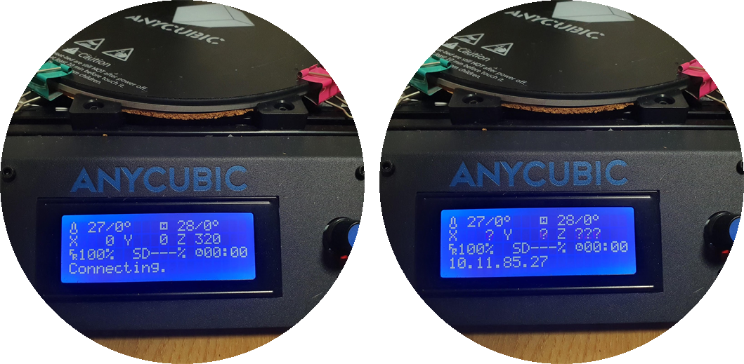 설치가 잘 되어 있다면 Anycubic Delta Kossel 프린터기 기준으로, 프린터기를 켜면 아래 사진과 같이 설정 시 지정한 SSID로 연결을 시도하고 연결이 완료되면 할당받은 아이피 주소가 화면 하단에 나타나게 됩니다.