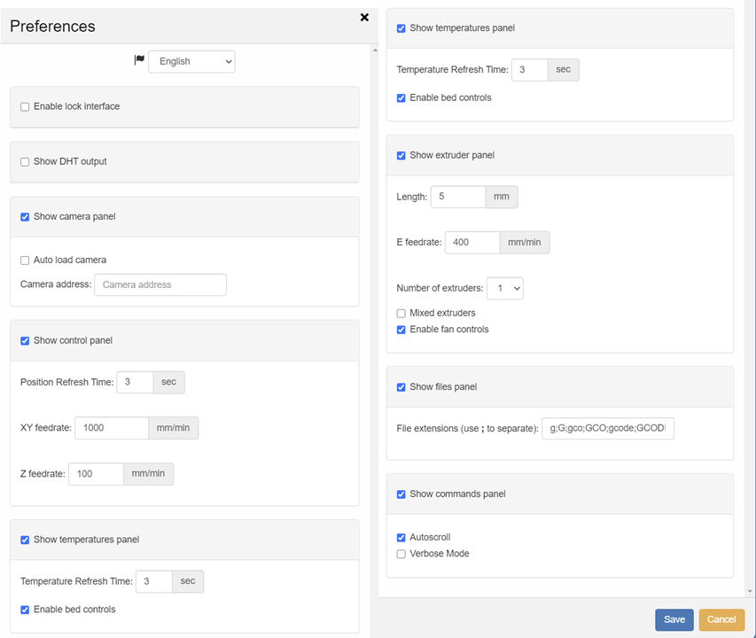 그 아래로 노즐 위치와 온도를 컨트롤 하는 패널에 대한 옵션이 보이는데요. 프린터기에 히팅 배드가 있는 경우 temperatures panel에서 Enable bed controls 옵션을 켜주면 되겠습니다. 익스투루더는 옵션에 팬 컨트롤 기능까지 포함되어 있고 그다음이 files panel인데, SD카드에 저장되어 있는 gcode파일을 확인하고 출력 명령을 내리거나 파일을 삭제할 수 있습니다. 여기 설정에서는 gcode로 인식할 확장자를 지정할 수 있습니다. 마지막으로 commands panel인데 여기서 gcode를 입력해서 프린터기를 컨트롤할 수 있습니다. 여기서 프린터의 시리얼 메시지를 모니터링하기 위해서는 Verbose mode 옵션을 켜주어야 합니다.