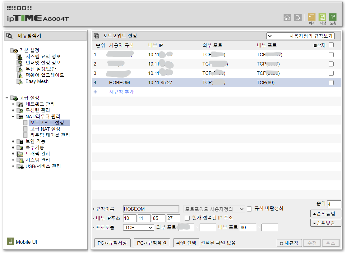 프린터가 네트워크에 연결되었으니 집밖에서도 접속할 수 있도록 만들어주겠습니다. ESP3D 접속 포트는 80번이니까 공유기의 포트 포워딩 기능으로 외부에서 접속할 포트를 ESP3D IP의 80번으로 포워딩되도록 규칙 추가하였습니다. 이제 어디서나 접속할 수 있는 온라인 프린터가 되었습니다.