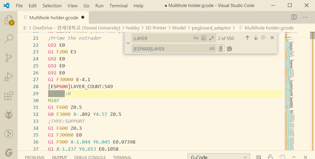 텍스트 편집기에서 ";LAYER"라는 문구를 일괄적으로 "[ESP600]LAYER"로 바꾸기를 하게 되면 레이어가 넘어갈 때마다 메시지를 보내도록 만들 수도 있습니다. 하지만 모든 레이어마다 메시지가 발생하면 문자 폭탄을 받을 수 있으니 빈도는 좀 조절할 필요가 있겠죠.