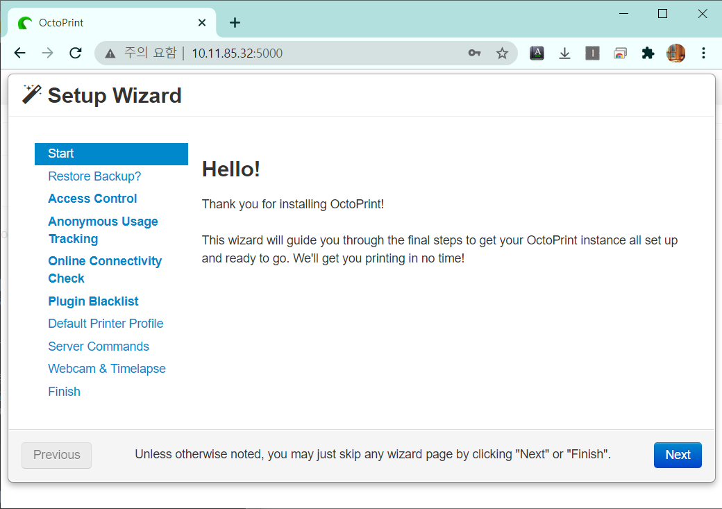 옥토프린트에 접속해 보겠습니다. 옥토프린트의 기본 포트는 5000번입니다. 웹브라우저에서 옥토프린터 주소를 입력해서 접속합니다. 다음 그림처럼 환영 메시지를 만나셨나요? 그럼 설치가 잘 되었네요.