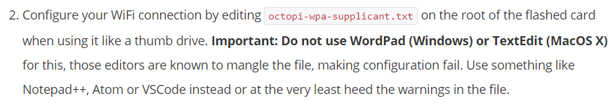 SD카드를 라즈베리파이로 옮겨 가기 전에 한 가지만 먼저 수정해줍니다. SD카드 내용을 파일 탐색기로 열어보면 "octopi-wpa-supplicant.txt"파일을 찾을 수 있는데요 여기서 라즈베리파이가 와이파이에 바로 접속할 수 있도록 네트워크 설정을 수정합니다.