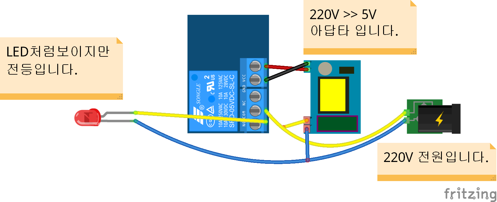전등에 원래 달려있던 스위치 대신에 릴레이를 연결만 하면 되겠죠. 그리고 220V 전원으로 전등만 켜는게 아니라 릴레이를 컨트롤할 ESP01 모듈에도 전원이 들어가야 하니까 220V AC를 5V DC로 변환시켜줄 변압 회로가 필요합니다. 별도의 전원 아답타를 써도 되지만 전등하나 켜는데 아답타까지 주렁주렁 달려있는 건 좀 아닌 것 같으니까요. ESP01 모듈은 3.3V로 동작하는 모드지만 릴레이 모듈에서 ESP모듈로 들어가는 전원을 변환해주는 것 같습니다. 컨트롤 전원으로는 5~12V범위에서 사용할 수 있다고 하네요.