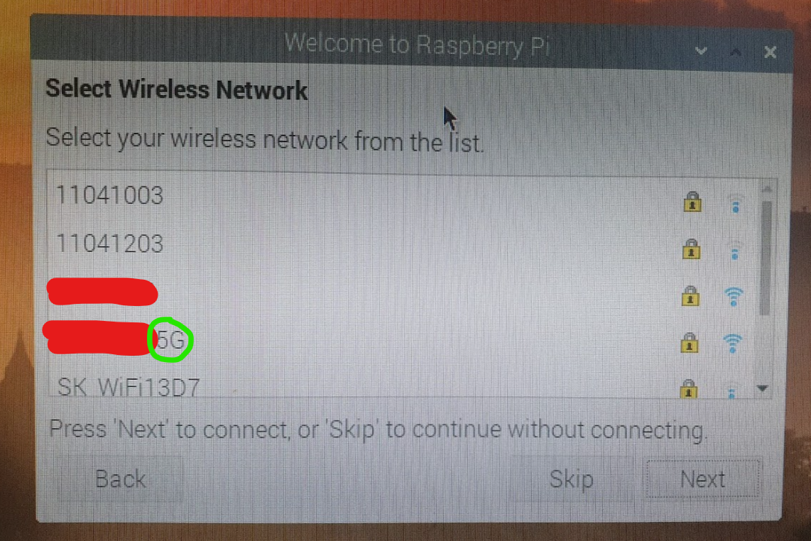 마지막으로 와이파이입니다. 이경우 와이파이 주파수에따라 케바케인 것 같은데 앞에서 지역을 한국으로 했을 때 와이파이 신호가 잡히지 않을 수도 있습니다. 그래서 미국으로 했었고 신호가 잘 표시되고 있습니다. 또 한 가지 고려할 부분이 5G 신호의 와이파이의 경우 나중에 끊김이 발생할 수도 있습니다. 제가 이해한 바로는 와이파이가 국가별로 인가된 주파수 대역이 조금씩 차이가 나서 라즈베리파이에서 사용국가를 선택하면 거기에 맞게 주파수를 제한하도록 합니다. 그런데 우리나라의 경우 인가 주파수에 대한 설정에 오류가 있어서 이런 문제가 발행하며 라즈베리파이 OS 쪽에서 이문제를 해결해야 하나 아직 미결이다 입니다. 구글링 해보면 미국이나 다른 나라의 설정값을 한국에 덮어쓰고 새로 빌드해서 고치는 방법이 있긴 한데 귀찮아서 전 그냥 미국 그리고 5G가 아닌 2.4G를 사용합니다. ㅡ.,ㅡ