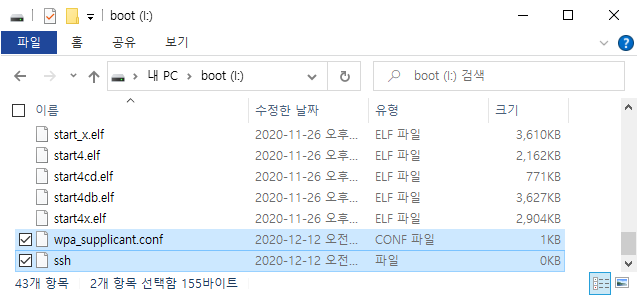 다음과 같이 2개의 파일이 추가되었습니다. 이제 SD카드를 라즈베리파이에 넣고 부팅합니다.
