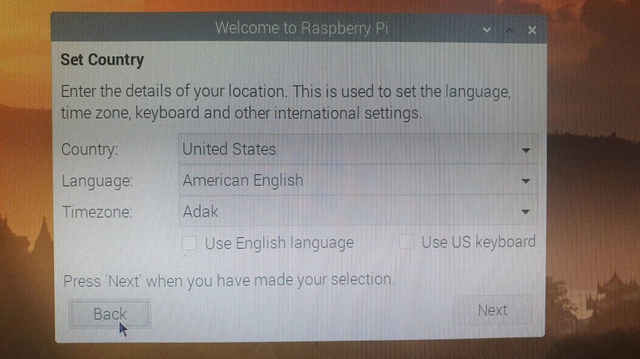 사용하는 국가와 언어 시간대를 설정하는 화면입니다. 여기서 자랑스러운 대한민국을 선택할 수도 있지만 이 로케일 설정이 와이파이에 영향을 주기 때문에 일단 미국이나 영국 등으로 해줍니다. 사용언어도 영어가 되어야겠죠. 아 참고로 여기서 언어는 라즈베리파이 OS의 표현 언어입니다. 영어로 했으니 영문 OS가 되는 거죠. 시간대도 지역을 미국으로 골라서 미주만 선택 가능합니다. 나중에 변경해주면 되니까 넘어가겠습니다.