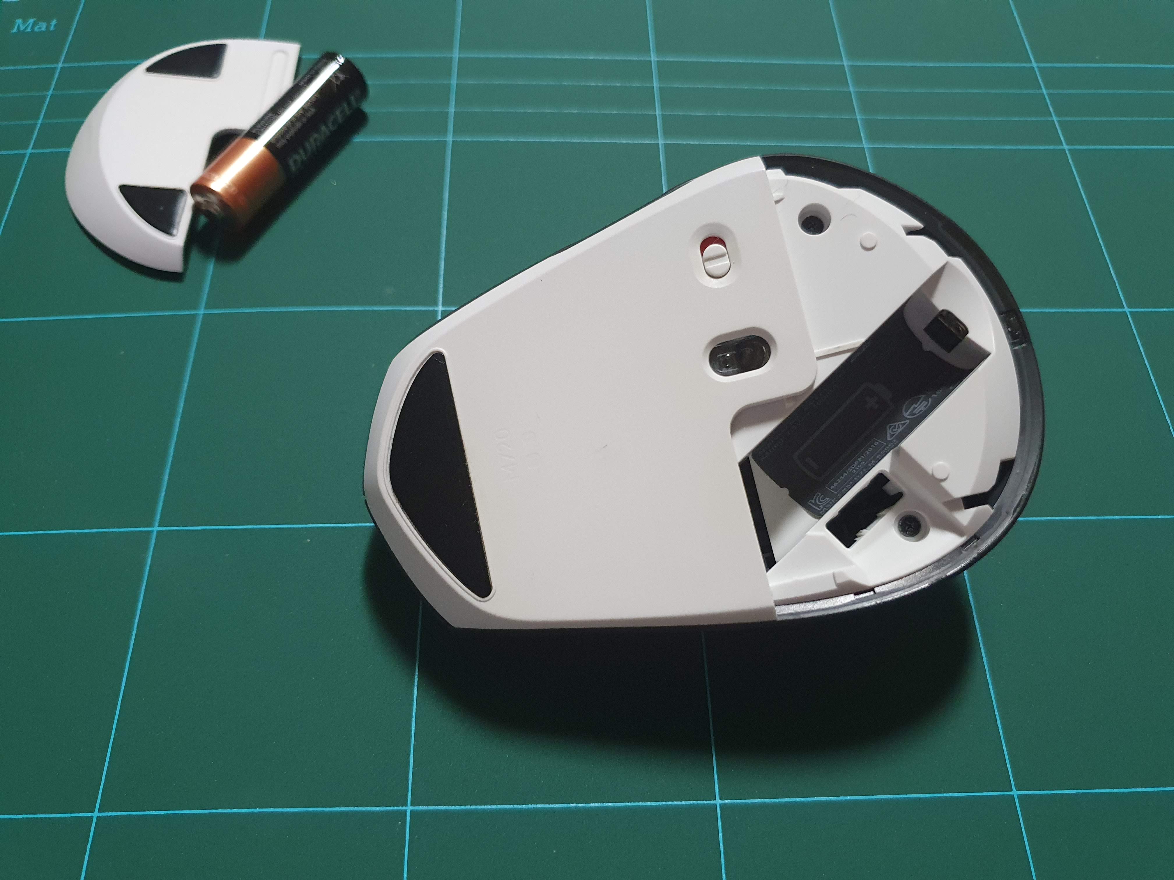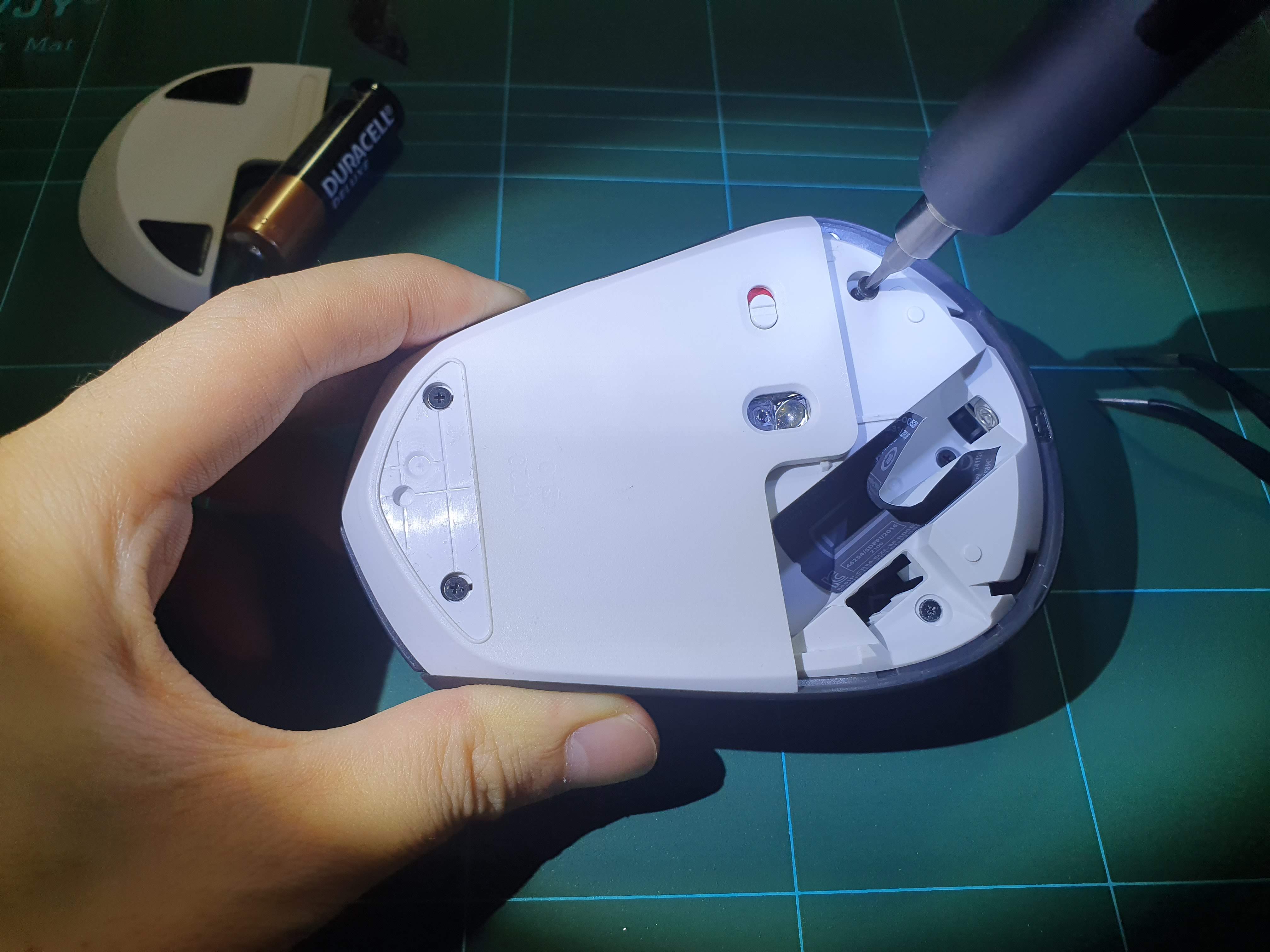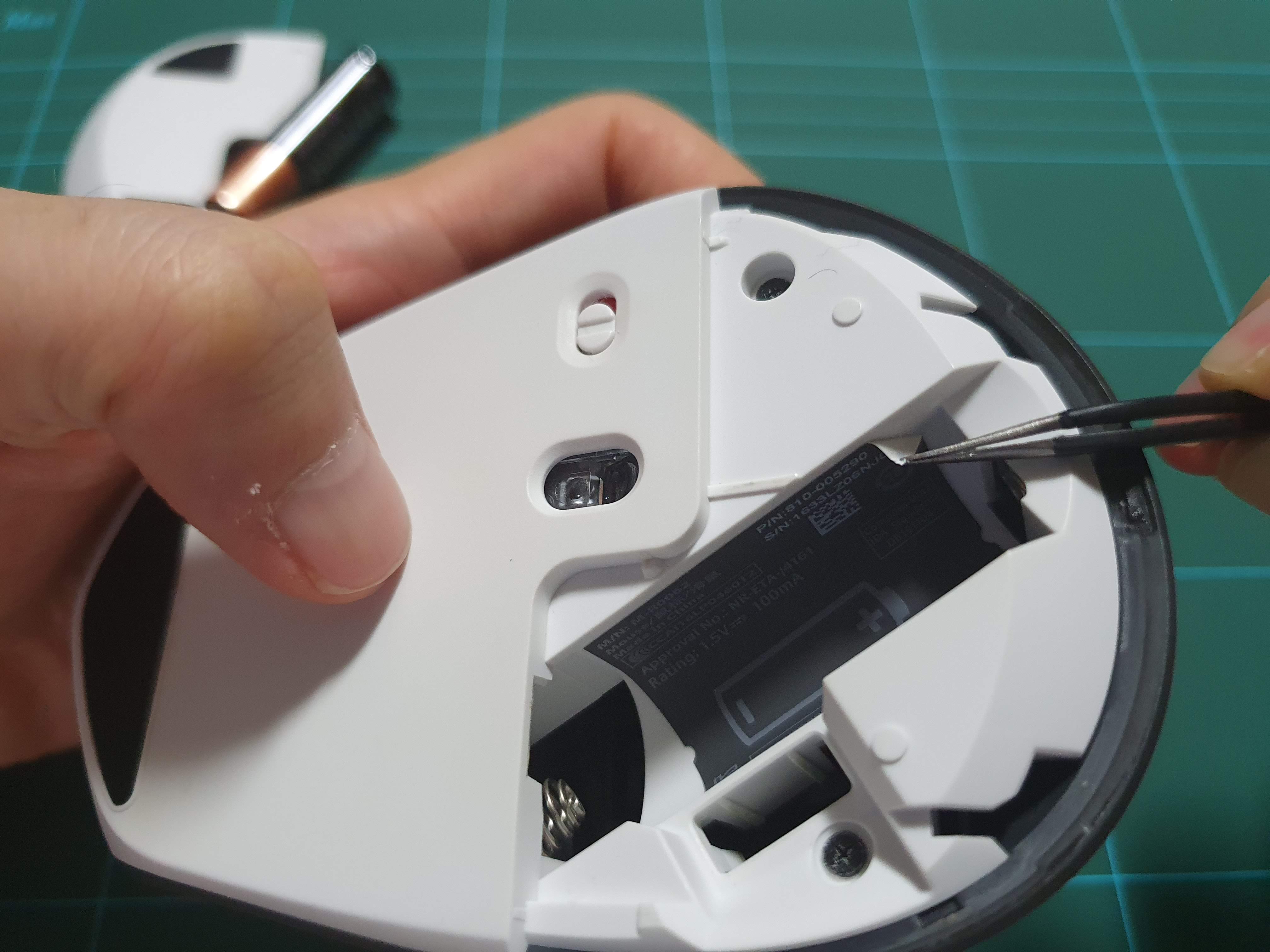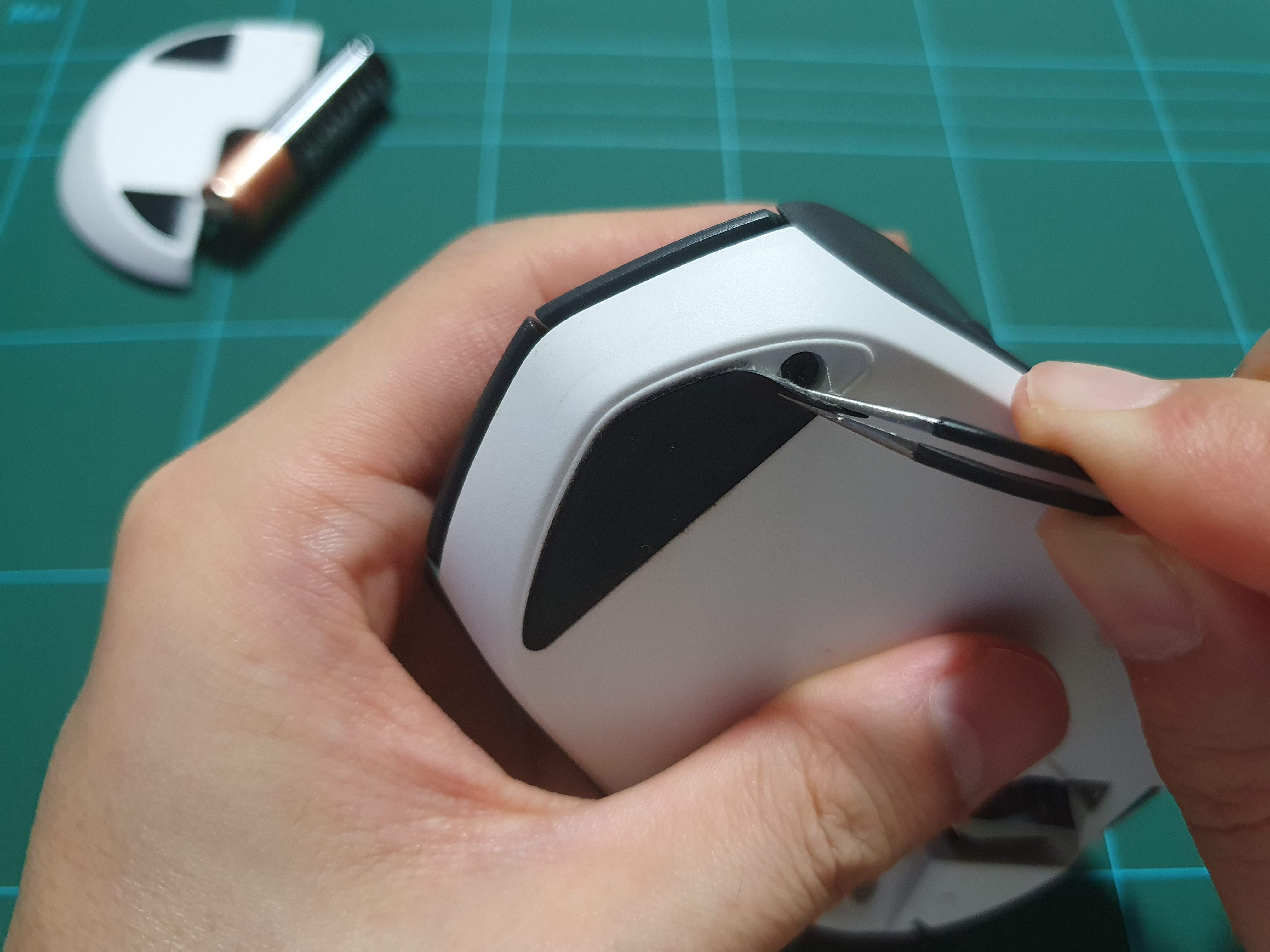 배터리 커버를 열고 나사를 풀어주면되는데요 몇개는 숨겨져 있습니다. 마우스 발바닥인 앞쪽부분 패드와 배터리 홈의 스티커를 조심조심 벗겨주면 숨어있는 나사가 보입니다.