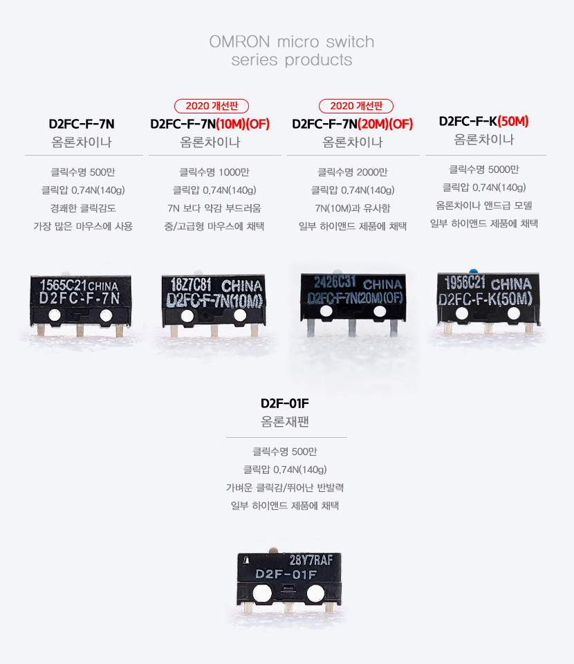 그런데 오므론 스위치란것이 여러 종류가 있고 수명과 클릭감도에 따라서 구분이 되는데 저는 클릭수명 2천만회에 2020년도 개선 버전이라고하는 D2FC-F-7N(20M)으로 구매하였습니다. 판매업체에서 잘 정리한 자료가 있어서 가져왔습니다. 종류별 특징은 아래 그림을 참고하세요.