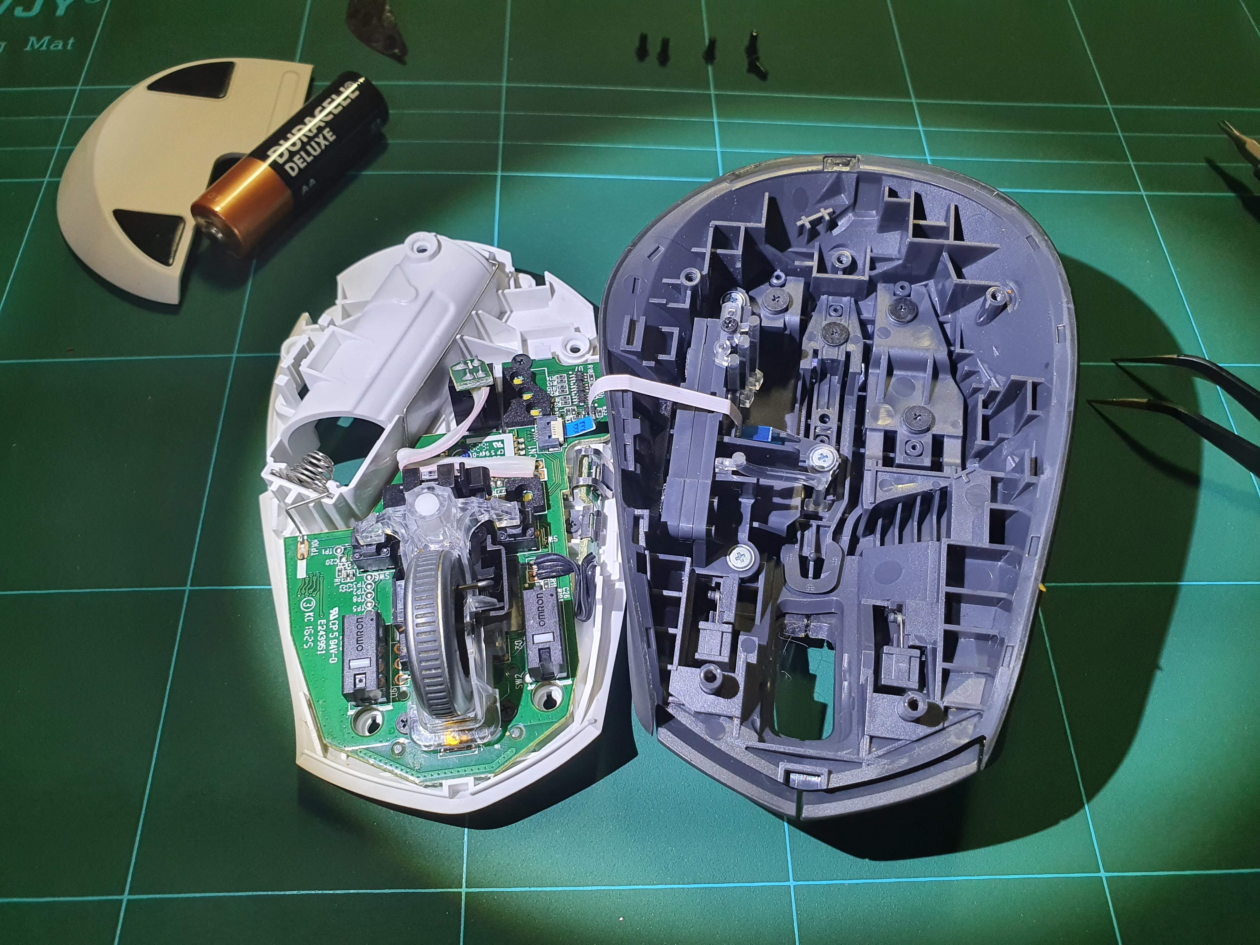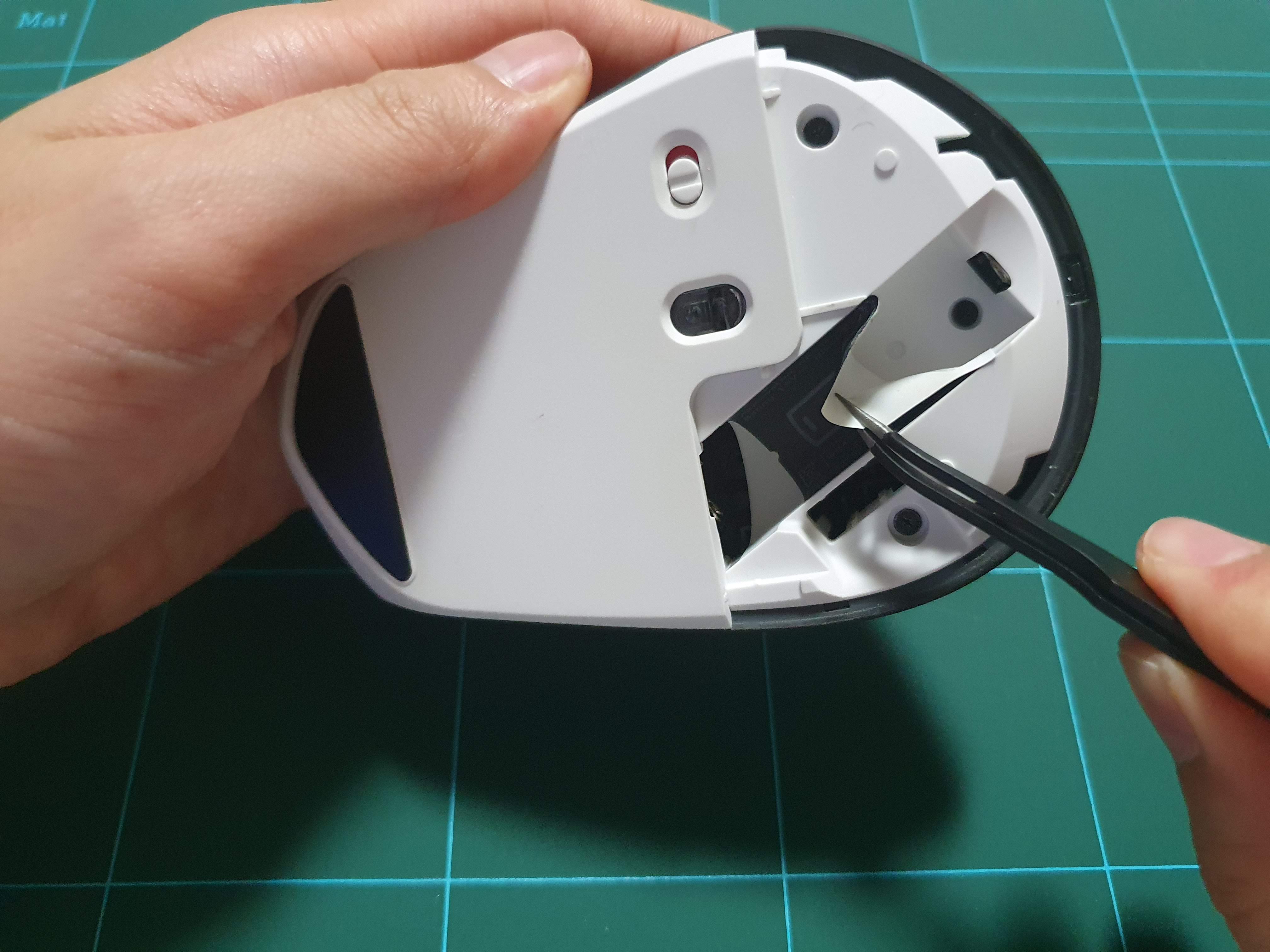 바닥면에서 일단 5개 나사를 먼저 제거해 줍니다. 나사를 모두 제거하면 별로 힘들이지 않고 마우스 바닥과 뚜껑을 분리할 수 있는데요. 이때 아래 위를 연결하고 있는 리본 케이블이 손상되지 않도록 주의합니다.