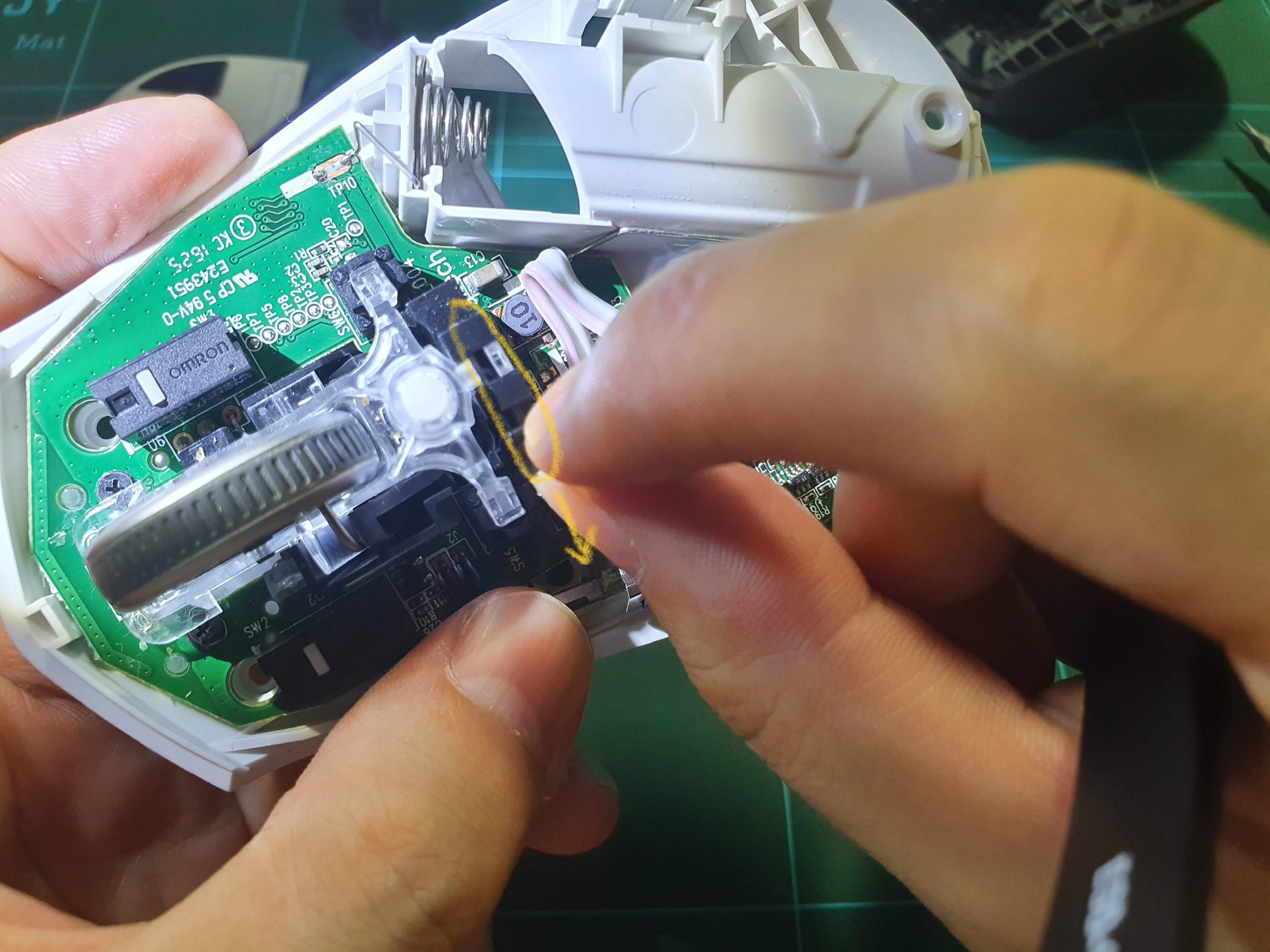 아래 사진에 표시한 플라스틱 핀을 손으로 당겨서 제거하고 휠을 분해합니다. 이때 휠 클릭의 탄성을 만들어주는 작은 스프링 2개가 숨어있는데요. 고정이 되어있지 않아서 휠을 제거하면 쉽게 도망갈 수 있습니다. 잃어버리지 않도록 주의합니다.