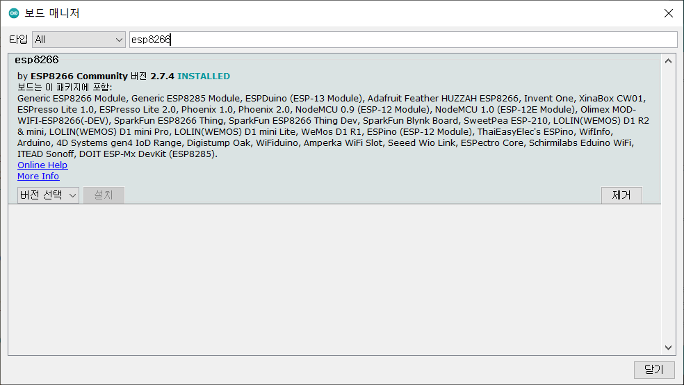 검색창에 "esp8266"이라고 검색해서 설치를 눌러주시면 됩니다.