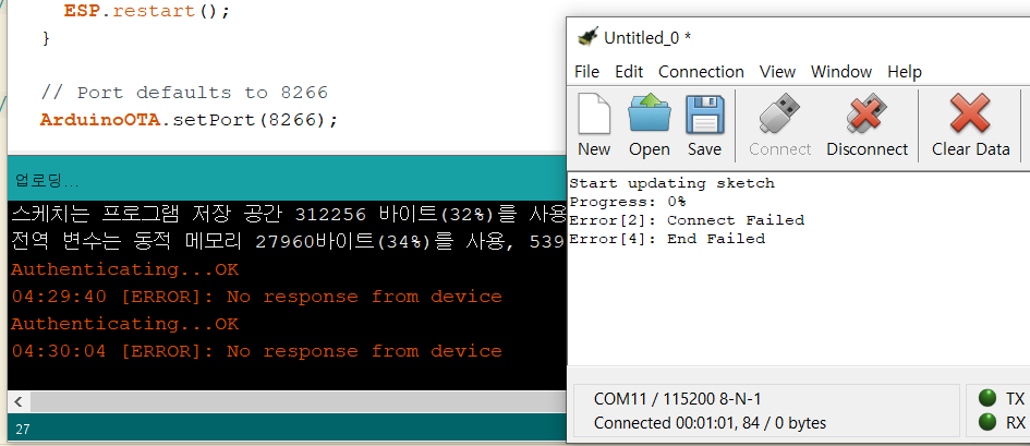 이제 준비가 끝났습니다. 지금부터는 원래 스케치를 업로드하는 것과 동일하게 업로드 버튼 꾹 눌러주시면 OTA 업데이트가 시작됩니다.
