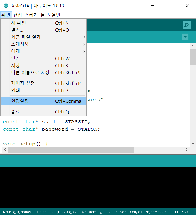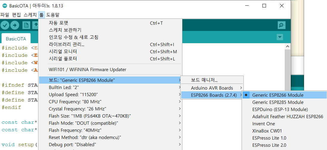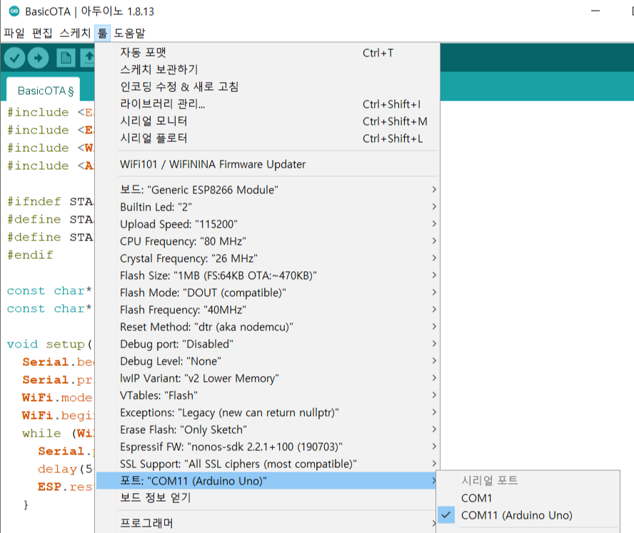 먼저 Arduino IDE에서 ESP8266 OTA 업로드 방법입니다.