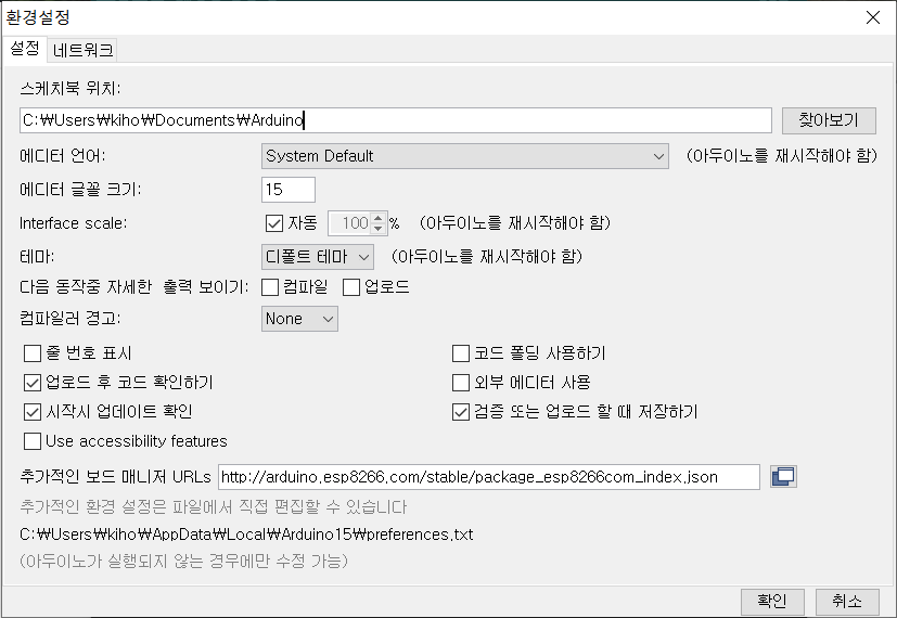 Arduino IDE에서 ESP8266 칩 개발을 위해서는 ESP8266 보드메니저가 있어야 하는데요 아직 설치되어 있지 않다면 "환경설정 > 추가적인 보드 매니저 URLs"에 아래 주소를 입력하고 설치할 준비를 해줍니다.