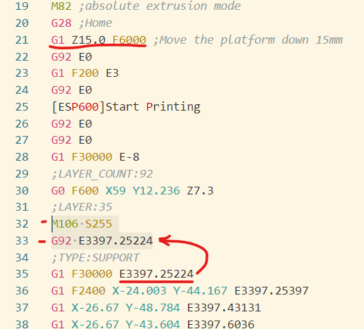 마지막으로 가장 중요한 익스트루더 초기화 작업에 수정이 필요합니다. 출력을 하는 동안 노즐 위치는 프린터 출력 공간의 절대좌표를 따르기 때문에 선행된 코드의 유무가 후행 코드에 영향을 미치지 않습니다. A위치에서 출력을 하라면 A위치로 가면 그만이죠 하지만 익스트루더는 얘기가 다릅니다. 익스트루더의 기준값은 출력을 시작하는 시점의 필라멘트 위치를 0이라고 가정하고 0에서부터 밀어내는 필라멘트의 상대 길이를 바탕으로 출력이 진행되기 때문인데요. 앞서 우리는 필요 없는 선행 코드를 지워버렸기 때문에 그동안 사용된 필라멘트 길이만큼 밀어내야 할 중간과정이 없어졌습니다. 그래서 현재 필라멘트 위치 값을 영점으로 인식하도록 코드 수정이 필요합니다. 35행에서 G1 F30000 E3397.25224라는 코드가 나타나는데 이상태 대로라면 프린터기는 출력을 시작하자마자 필라멘트를 3.3m를 일단 뽑아내고 시작하게 됩니다. 그래서 33행에 추가된 G92 명령어에 35행의 익스트루더 값 E3397.25224를 복사해서 현재 필라멘트의 위치가 3393.25224만큼 이미 밀어낸 상태임을 강제로 재설정해 줍니다.